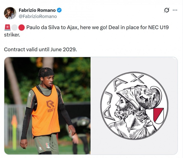 1月22日讯 据知名记者罗马诺报道,奈梅亨18岁前锋保罗·达席尔瓦将加盟阿贾克斯,Here we go!罗马诺透露,阿贾克斯有意引进荷兰前锋保罗·达席尔瓦,已就球员的转会达成协议,将与这位小将签约至2029年。保罗·达席尔瓦2024年加盟奈梅亨青训,目前效力于奈梅亨U19梯队,本赛季出战12场比赛,打进14球。...